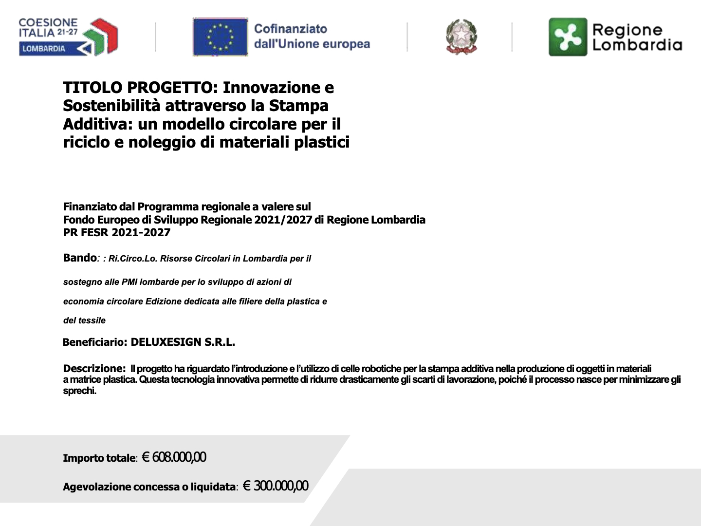 Finanziamento per il Progetto di Economia Circolare di DELUXESIGN S.R.L. per la Riduzione degli Sprechi nella Produzione di Plastica